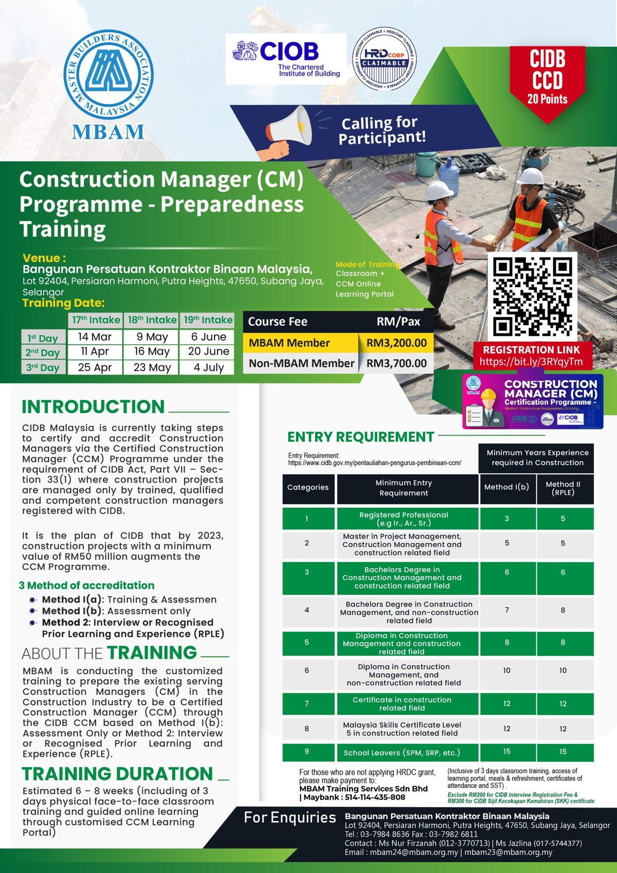 In line with our objectives to prepare the existing serving Construction Managers in the Construction Industry to be a Certified Construction Manager (CCM), MBAM is calling for KUALA LUMPUR Intake of the above training through the CIDB CCM Method 3 Certification through interview based on Recognition Prior Learning and Experience (RPLE).