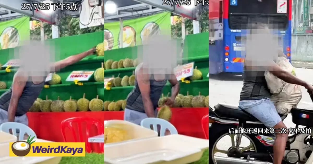 In a bizarre daylight robbery, a durian vendor in Puchong was left shocked after a thief on a motorcycle targeted his stall—not for money, but for durians.