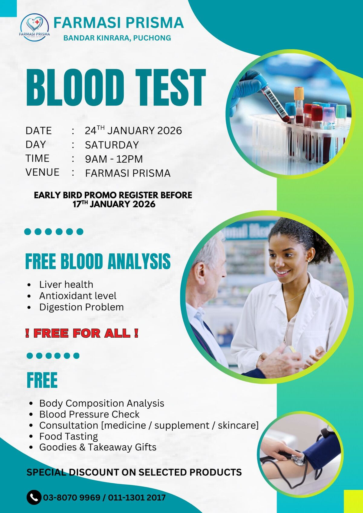 Take a proactive step towards better health at the Blood Test Campaign & Free Health Check Day hosted by Farmasi Prisma! This special health event is designed to help you better understand your body and overall well-being through a range of complimentary screenings and activities.
