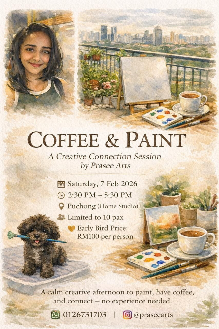 Hi everyone! I’ll be hosting a small and cozy Coffee & Paint session at my home studio in Puchong. This session is perfect for anyone who wants to relax, enjoy a cup of coffee, and explore their creativity in a comfortable, friendly setting.