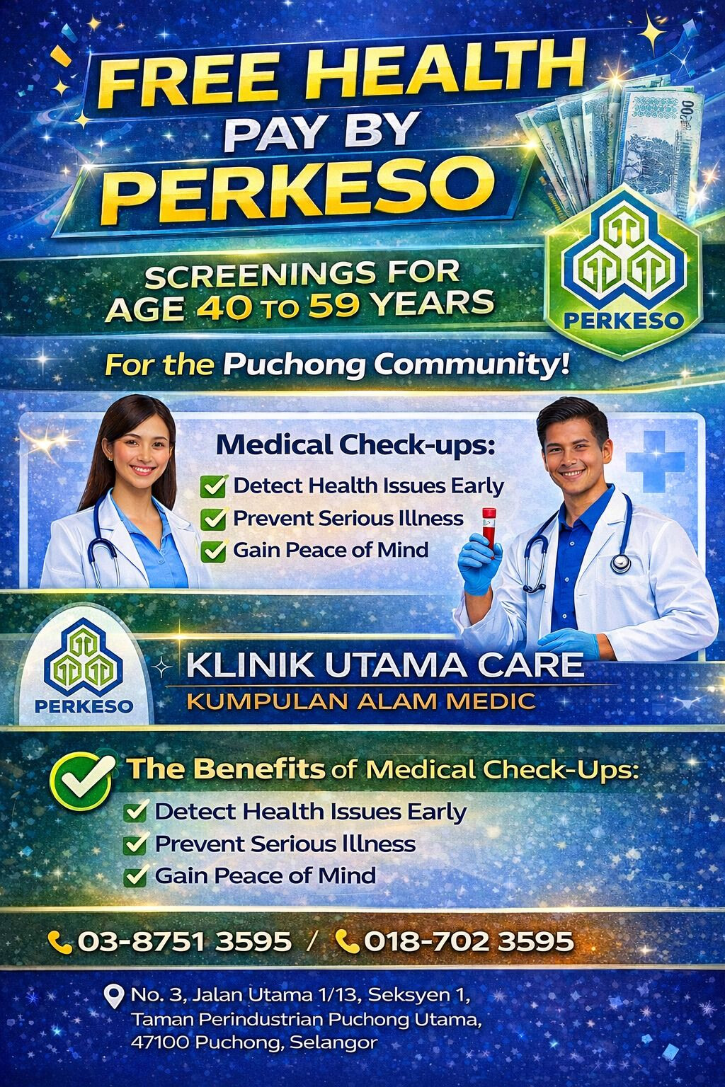 Residents of Puchong are invited to take advantage of a FREE Medical Check-Up, fully sponsored by PERKESO. This initiative is designed to promote early health screening and encourage proactive healthcare within the community.